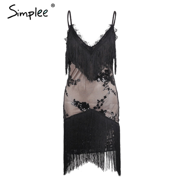 Simplee Halter sequined black lace dress Women sexy v neck mini dress Fringe tassels bodycon dress christmas party vestidos